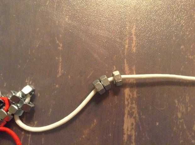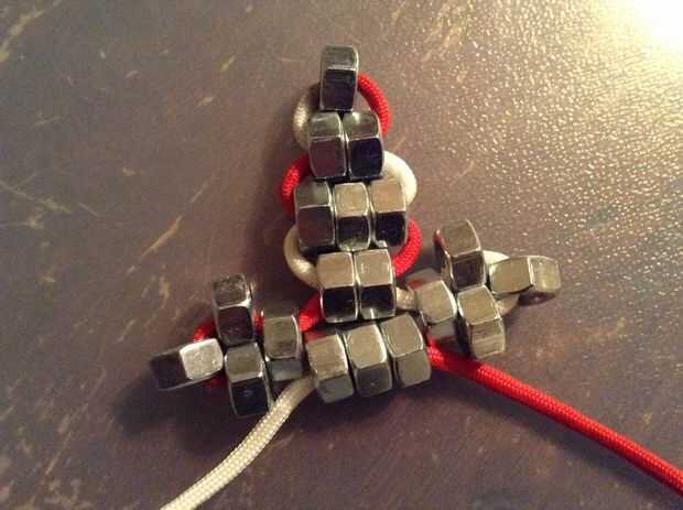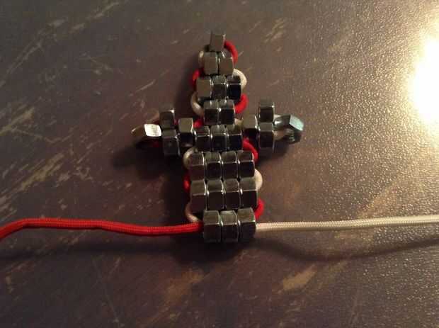 Now to the body. Poner tres tuercas en una cadena de blanca y enrósquelo con la cuerda roja. Ahora agregue 4 tuercas más. Otra vez repetir y hacer cuatro más. Ahora añadir tres más las tuercas.