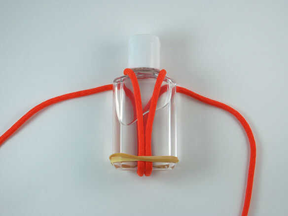 Coloque la banda elástica alrededor de la parte inferior de la botella para la fijar el paracord en lugar.