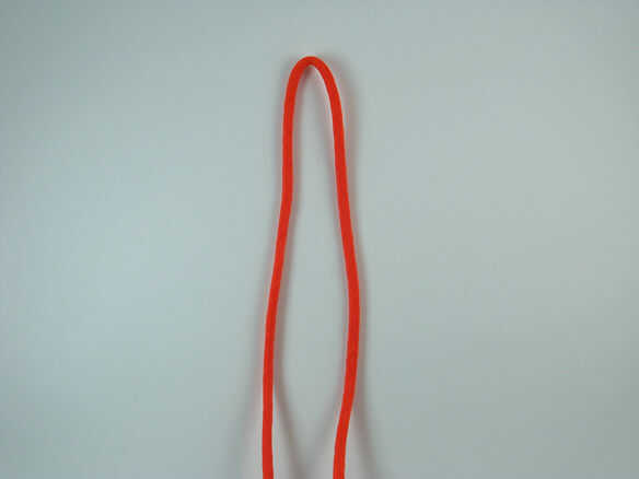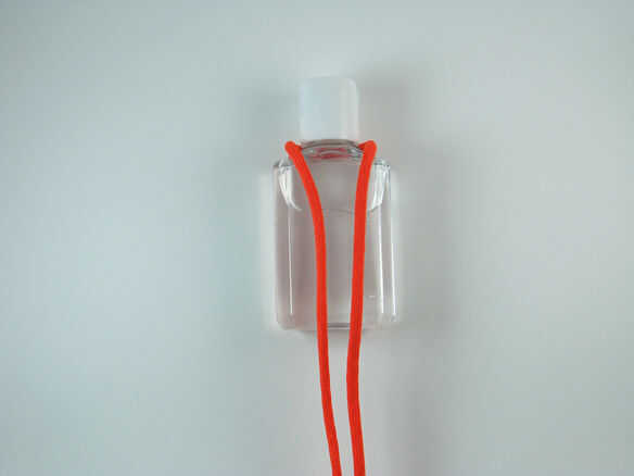 El centro de la paracord y formar un bucle en el centro. Tome el lazo y envuélvalo alrededor del cuello de la botella de desinfectante de la mano. Luego ejecute las dos hebras por la mitad a la parte inferior y respaldo al otro lado.