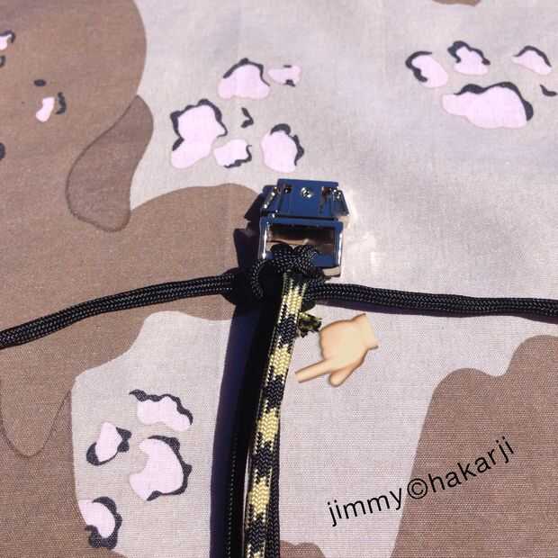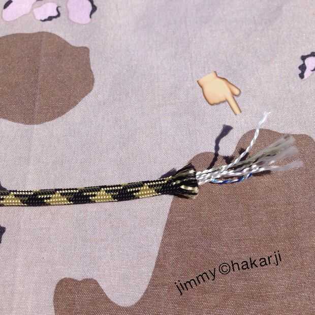 1 tome su pedazo corto de paracord y tire de los hilos del centro para que tenga una pieza hueca vaciada de paracord Esto permitirá que el cable de posición plana mientras que teje sobre ella 2 Ejecute el trozo pequeño de cable entre los cables del dos centro así que tienes sobre un exceso pulgadas colgando hacia la parte posterior