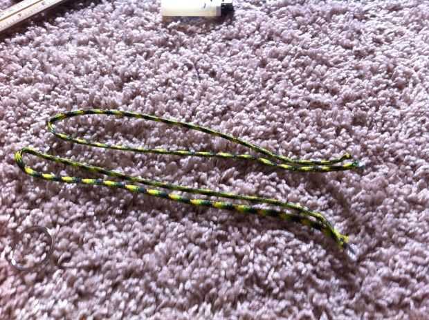 pulseras Paracord hacerlo con un Flatline o trazador (Flatline es un filamento de Paracord con la cadena de centro sacado y trenzado en la parte superior de un brazalete de Paracord y un trazador es un pedazo de micro paracord trenzado a lo largo de