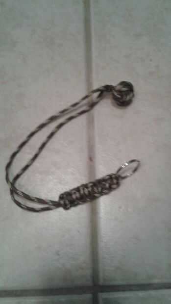 al final de este llavero fue hecho por la instrucción de "Kevin Gagne". Aquí usted puede encontrar su YouTube video:Paracordist cómo atar el nudo del lazo en un paracord monos puño llavero fob