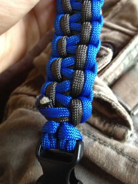 pulseras Paracord hacerlo con un Flatline o trazador (Flatline es un filamento de Paracord con la cadena de centro sacado y trenzado en la parte superior de un brazalete de Paracord y un trazador es un pedazo de micro paracord trenzado a lo largo de