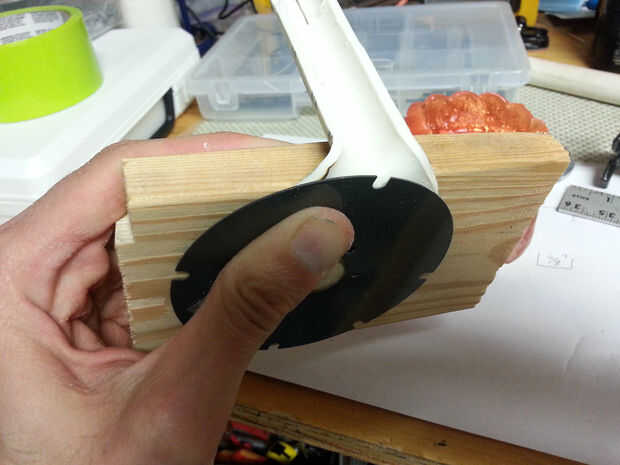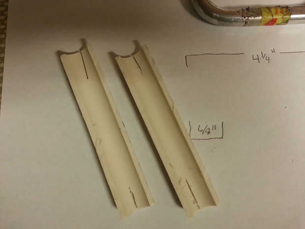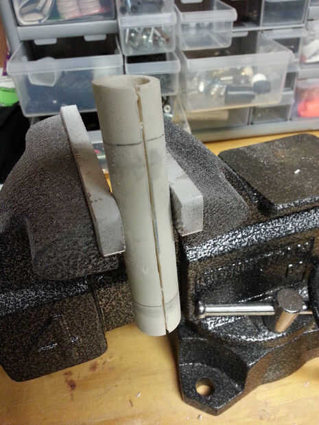 Ahora corte el PVC a la mitad longitudinalmente con dos cortes largos en lados opuestos. Un vicio puede ayudar. Corte con paciencia.