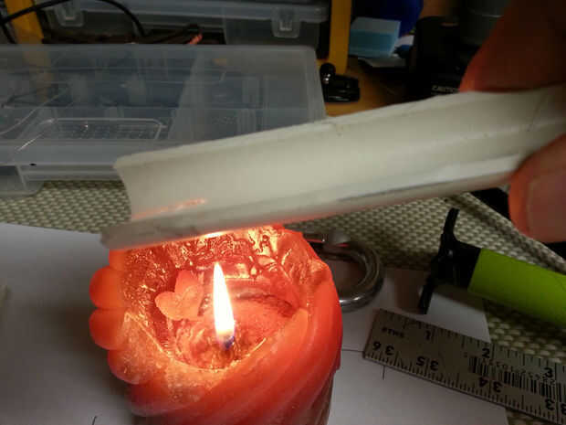 Encienda la vela y muy suavemente y lentamente, como una melcocha que no quiere encenderse, asado uno de los cuatro extremos durante unos 10 segundos, girando constantemente aproximadamente 2" de la llama.