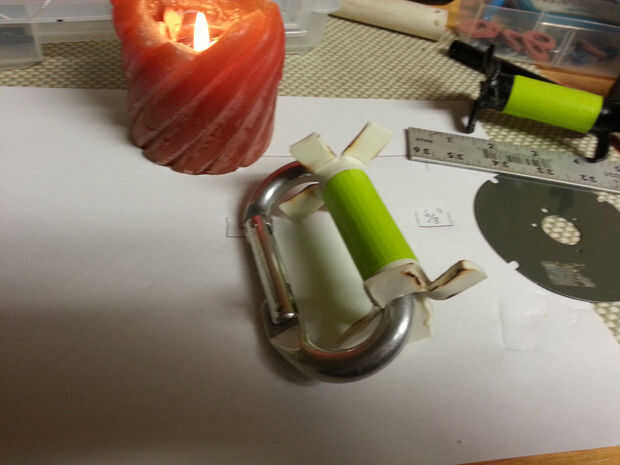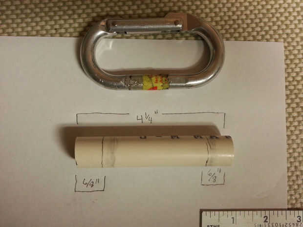 Montar las dos piezas alrededor de la barra del mosquetón. Utilice la cinta de conducto para mantenerlos juntos. Añadir más cinta si desea almacenar también unos pies de cinta del conducto.