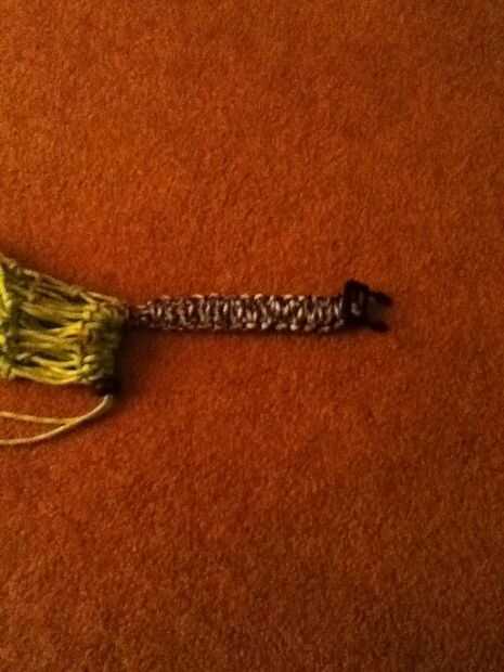 necesita aproximadamente diez pies de paracordPaso 1: Tomar un extremo de la paracord y poner la hebilla luego tome el extremo y tire hacia abajo en forma de bucle y tire los dos hilos a través del lazo y tire firmementePaso 2: tejer El comienzo de l