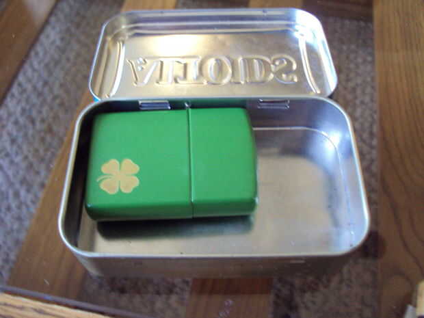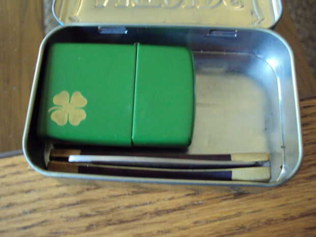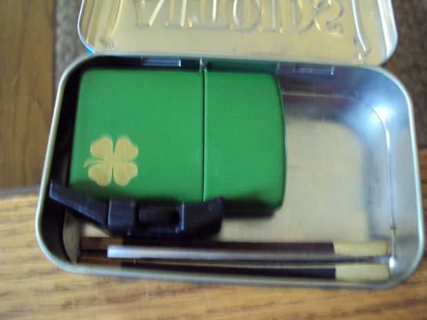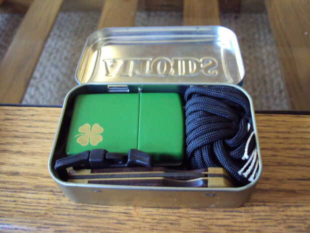 En primer lugar, poner tu anillo de llave en la esquina superior izquierda y luego poner tu zippo de eso. Línea a continuación, su cuchillo en la parte inferior, pegar la hebilla entre el zippo y el cuchillo, luego poner su envuelto paracord en la esquina superior derecha (usar longitudes de brazo de 2, 3 y 4).