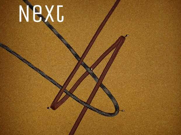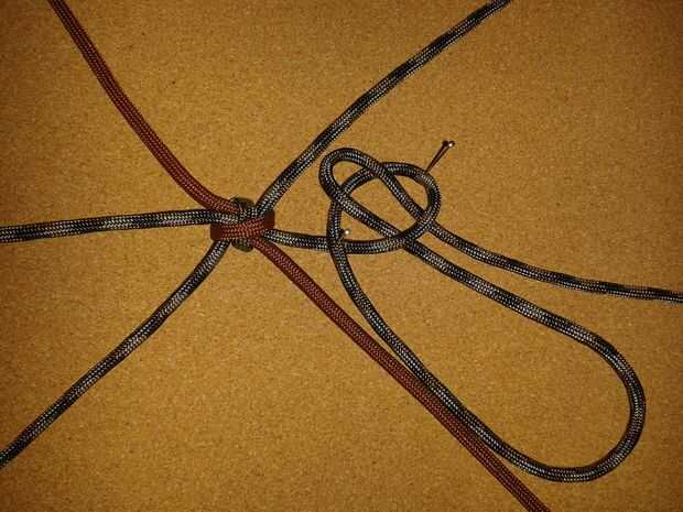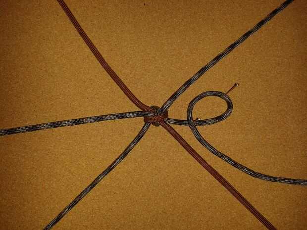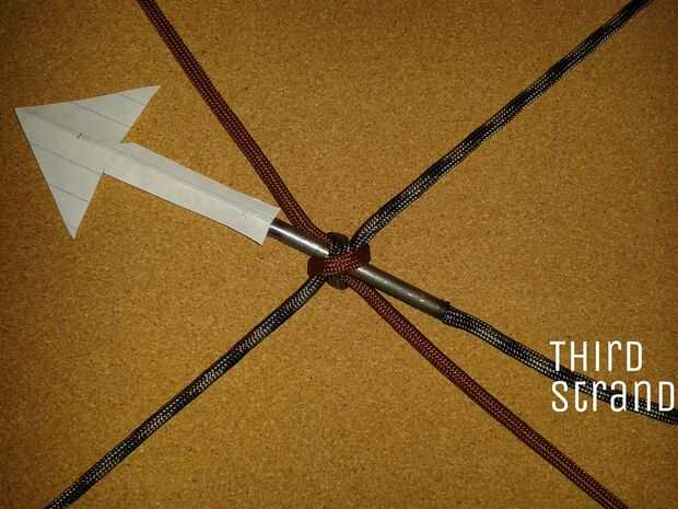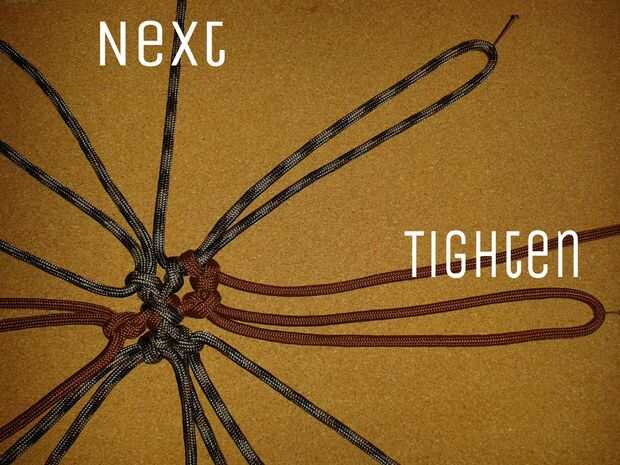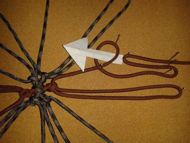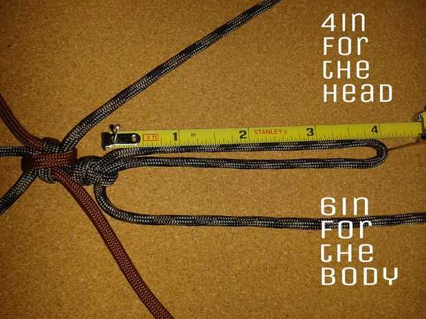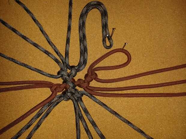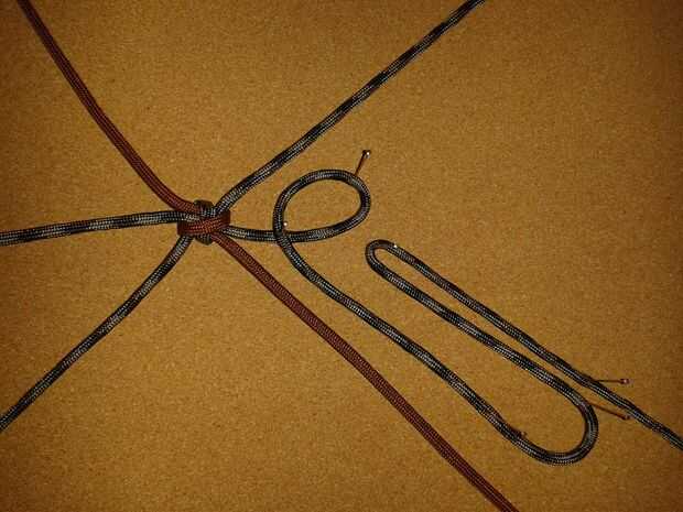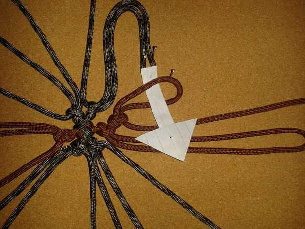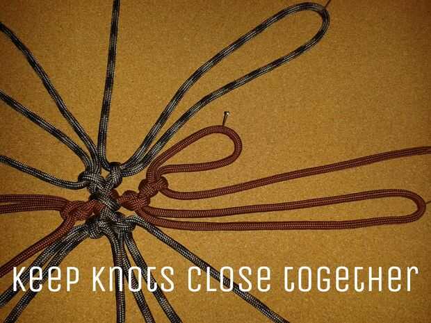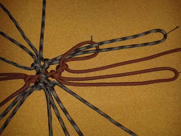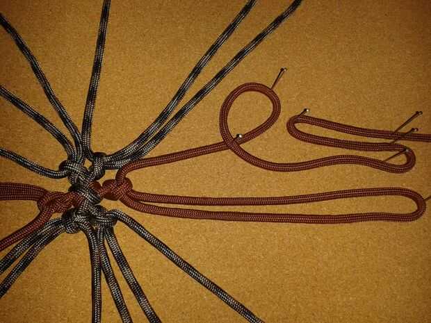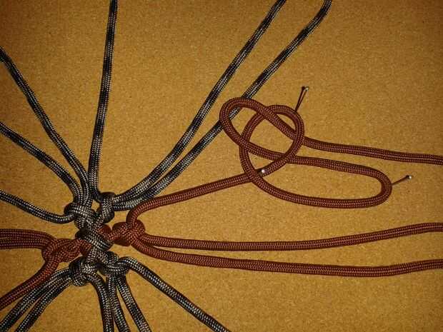With each 12 ft piece of brown camo and one piece of 12 ft brown paracord, follow the images to start tying the head. Repita con el las longitudes tres 18 pies para iniciar el cuerpo.