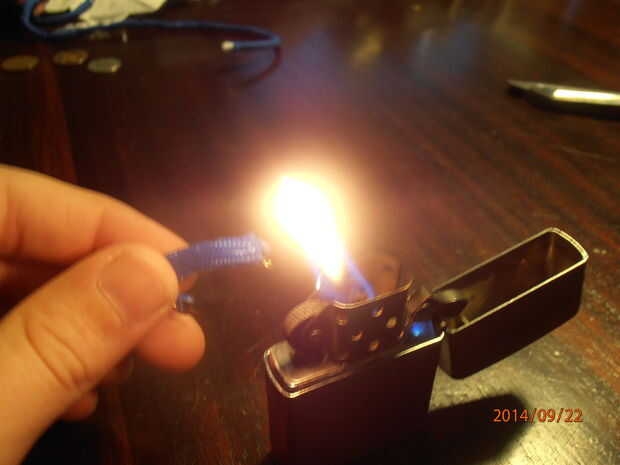 Tirón zippo y derretir el paracord por lo que permanece en el gancho.