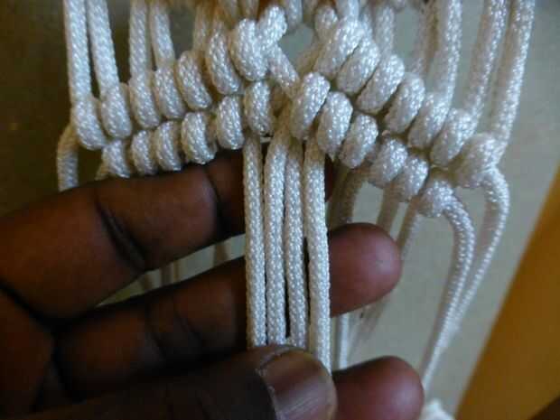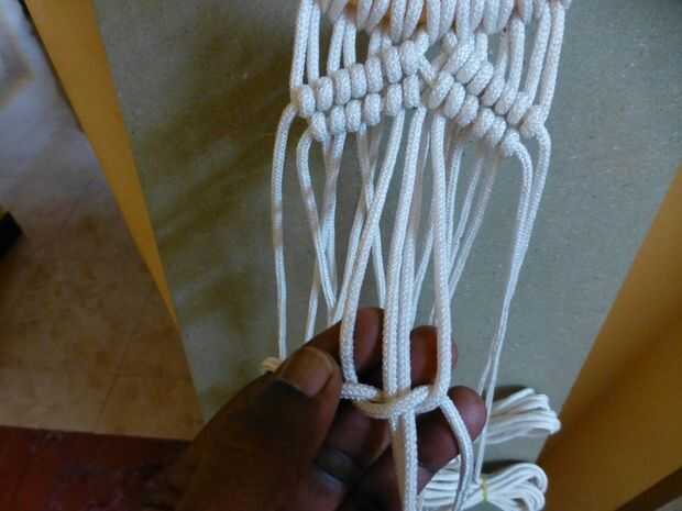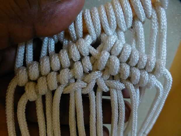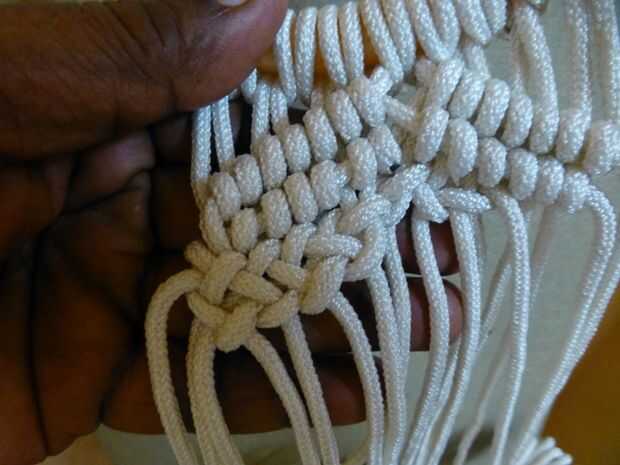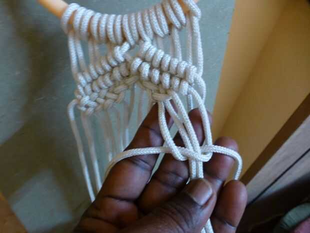 • Comience alternando nudos cuadrados usando una hebra de la izquierda con tres en el paso anterior hacia la izquierda