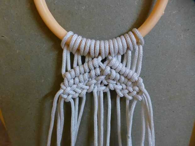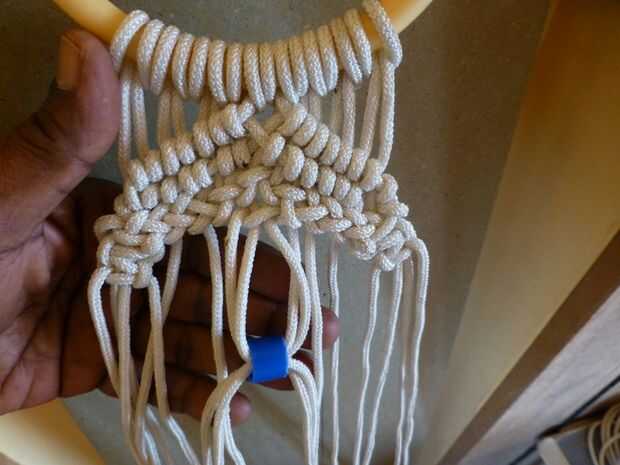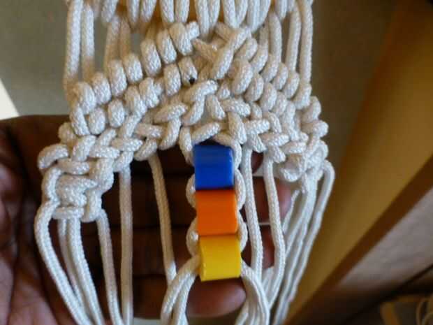 • Inserte los dos cordones de izquierda a derecha y dos cuerdas de derecha a izquierda a través de la pieza de plástico de los rotuladores. Puede utilizar granos o cualquier otro material para este