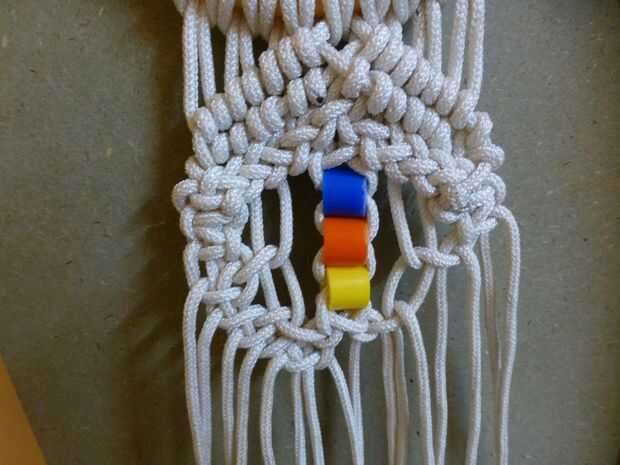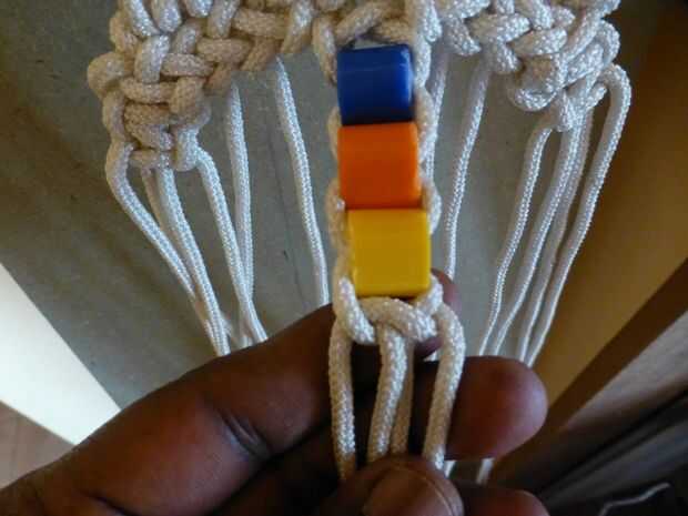 • Utilizando los cuatro cordones que se inserta a través de las piezas de plástico, un nudo cuadrado mantener cualquiera de las dos en el centro
