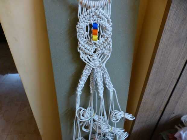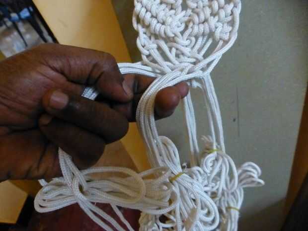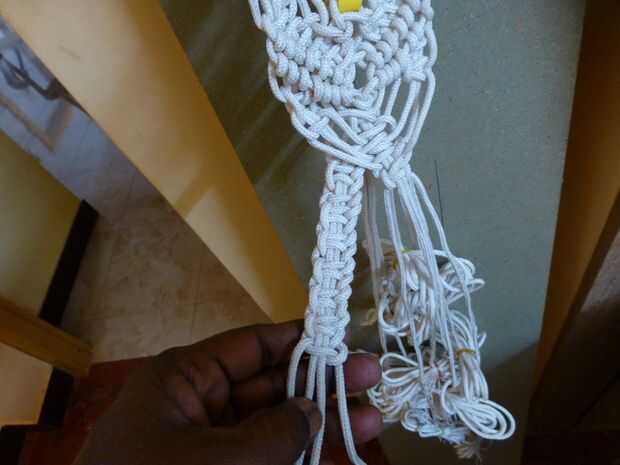 Llevar a cada grupo por separado y amarre 15 números de alternadas Plaza nudos alrededor de los dos cables del mediados. La última foto muestra cómo esto se verá después de completar este paso.