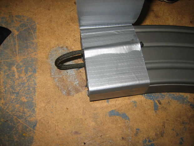 Pic3. Paracord en bucle sobre el fondo de la revista, cubrirlas con cinta para formar el bucle. Me gustan los lazos en mis revistas de un tamaño decente, así que no importa qué guantes que llevo, yo puedo todavía "gancho" del lazo y tire la revista de la bolsa del mag.
