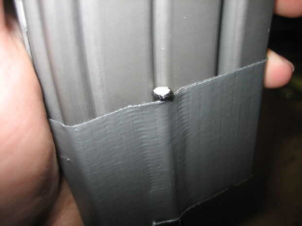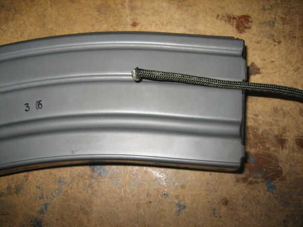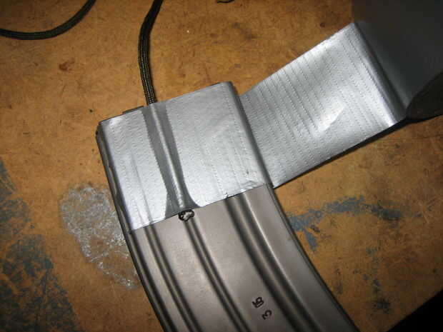 Envuelva el mag con la cinta de 100mph un par de veces, no a mucho, o la revista será grasa y tigher incluso en la bolsa del mag, pero no tan poco que saque el paracord en vez de la mag.