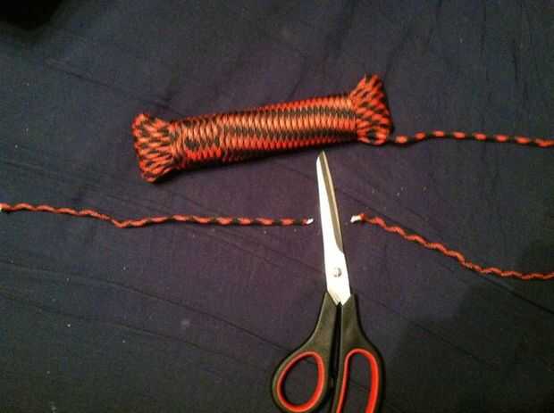 Corte un pedazo de 6 pulgadas de paracord y quema o los extremos con cinta adhesiva para que no se debilite hacia fuera. Usted todavía tendrá pies 5½ izquierda.