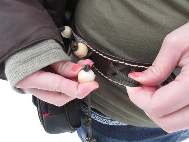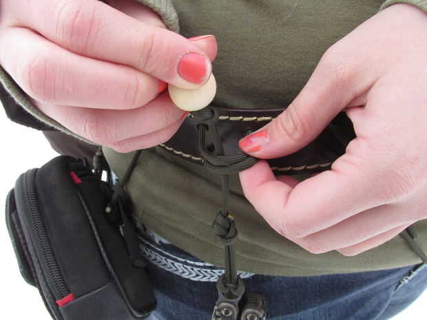 Para conectar la herramienta acollador a la correa de senderismo empezar soltando la palanca doble.  A continuación tire cierta holgura en el bucle donde desee adjuntar el elemento de amarre de herramienta crear lazos, como se muestra en la imagen.  Por último, pase el extremo de la tira de la cuerda de la herramienta a través de los lazos y tirar el juego fuera el paracord atado por la correa de la herramienta en lugar de la cerradura.  Una vez hecho todo esto, puede volver a apretar la palanca para asegurarse de que todo permanece fijo en su lugar para que nada se pierde mientras estás senderismo.
