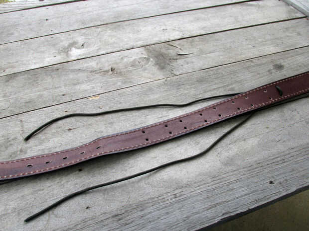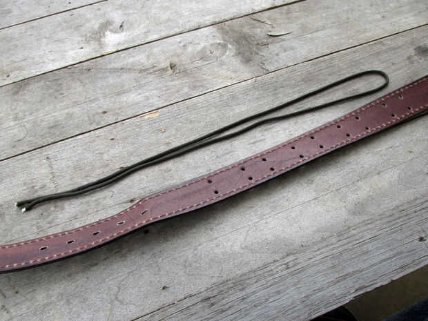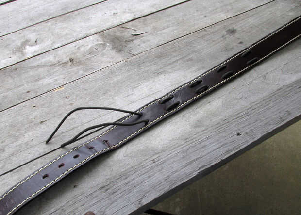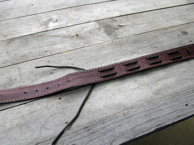 Una vez que has marcado y perforado los agujeros el siguiente paso es tejer el paracord a través de los agujeros.  Empezar a tejer en la parte posterior de la correa y continuar tejiendo como se muestra en la imagen hasta que han tejido el paracord por todos los agujeros que perfora.
