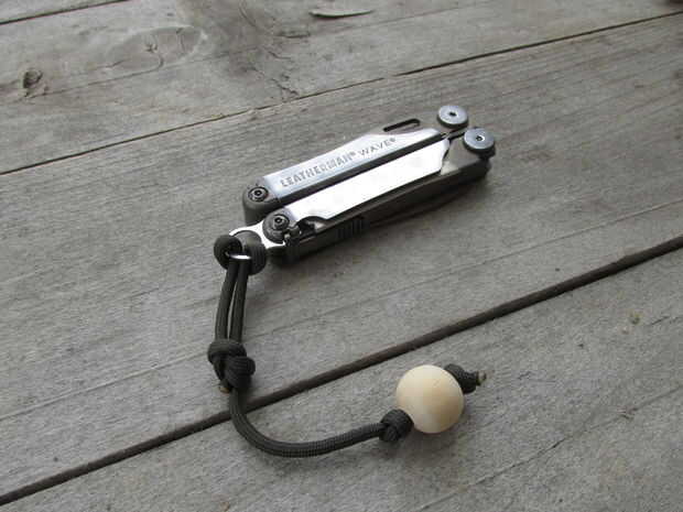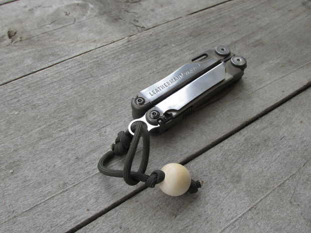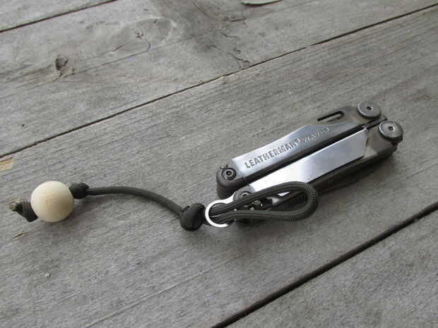 1. Comience por pasar el extremo del lazo de la cuerda de la herramienta a través de los lazos del cordón de la herramienta (en este caso una Leatherman Wave Multi herramienta).