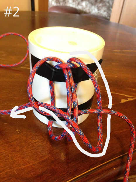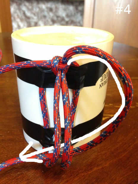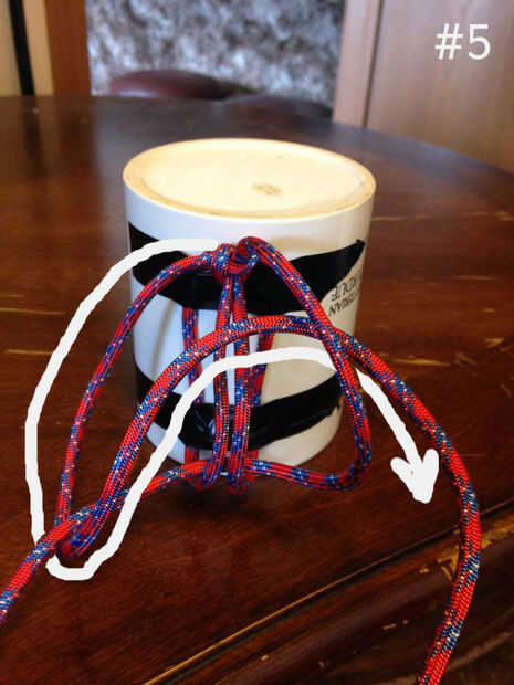 5. Tome la cuerda izquierda e hilo bajo el cable que solo trajo y luego ponerla sobre el mango y a través del lazo creado por el cordón derecho en foto 4