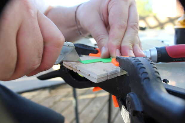 Corté una pieza de plástico de una botella de jabón de lavandería vacía. Recortado a tamaño y unido a un lado del agujero.