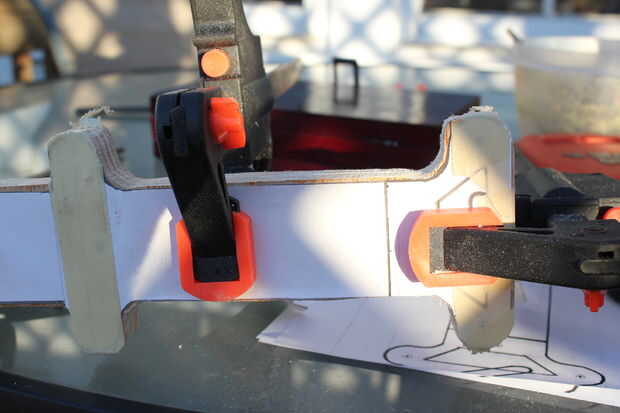 Con contorno de corte en la cinta de enmascarar, era hora de traer en las abrazaderas para mantener los espacios en blanco para dar forma final.