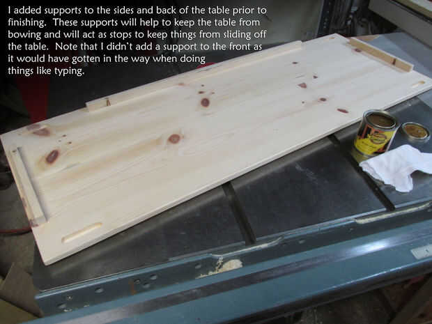 Después de encaminamiento de las ranuras de las poleas agregué unos rieles a la mesa en los laterales y parte posterior.  Estos rieles sirven dos propósitos, primero se guardan cosas de desplazamiento fuera de la mesa si se golpea y la segunda que ayudarán a mantener la mesa de inclinación del tiempo y uso.  Los soportes fueron cortados de trozos de madera de pino y se fijaron en su lugar con pegamento de madera.