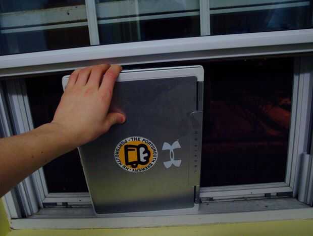 Coloque la laptop entre la ventana y el alféizar de la ventana y dejó la ventana poner su peso en el portátil, bloqueo en su lugar.