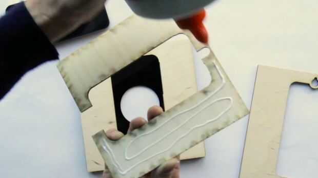 Pegamento o cola para madera de Elmer funciona muy bien. Aplique el pegamento con moderación para evitar el exceso de pegamento que se filtra fuera de los bordes. Si eso sucede, limpie cualquier exceso de pegamento con la toalla mojada. Como el pegamento comienza a secar, inserte el teléfono Asegúrese de que encaja y tratar de hacer los bordes de las capas en línea de todos los lados tanto como puedas. Abrazaderas o clips mariposa grande pueden ayudar un poco, pero asegúrese de mantener los bordes alineados.