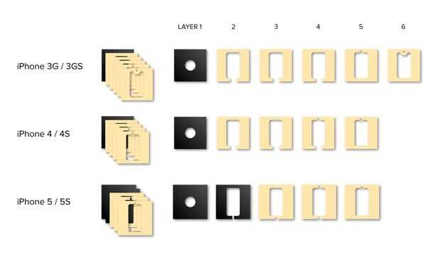 Ver el diagrama de arriba en que capas encima de la otra. Si usted está confundido o inseguro, apilar las piezas hasta y probar el ajuste con el teléfono primero antes de pegar.
