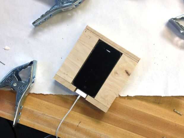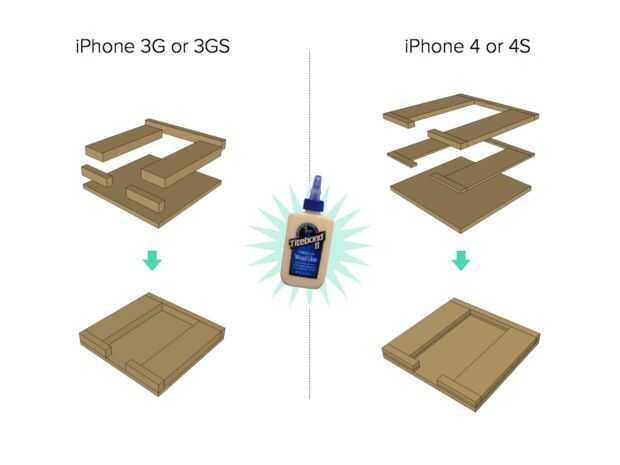 Puede ordenar de adivinar qué piezas van donde, pero si te pierdes, vea el diagrama. Usé pegamento de madera Tite bond, pero creo que funcionaría incluso pegamento de Elmer. Limpie cualquier exceso de pegamento con la toalla mojada. Asegúrese de tratar de poner el iPhone como montar las piezas para asegurarse de que cabe. Tenga cuidado de no hacer demasiado apretado, como el interruptor de sueño no debería ser presionado permanentemente. Pinzas o ganchos grandes pueden ayudar a mantener las cosas Unidas. Espere pacientemente a que el pegamento se seque (como máximo el perro).