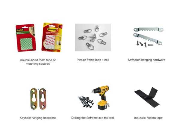 Aparte de una cinta de espuma doble cara, hay un montón de maneras que esto puede colgar. La opción fácil es conseguir un lazo de gancho de marco de cuadro, o un gancho de ojo de la cerradura para marcos. También podría trabajar una técnica colgante diente de sierra.