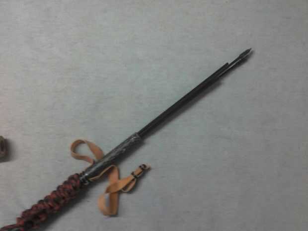 muestra cómo hacer un arpón, similar al arpón de Hoffman, previsto como una especie de herramienta de supervivencia minimalista. Es 8 pulgadas de largo, con 2 y una mitad pulgada hoja, la empuñadura está envuelta en paracord.No han hecho una funda pa