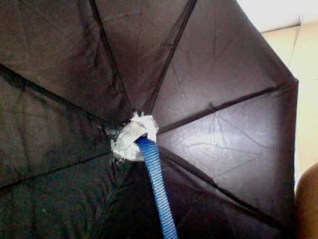 en nuestro modelo hemos utilizado cinta de plata y pegado alrededor del extremo de la correa fuera te aferras a él y también poner cinta alrededor del agujero en la parte superior del paraguas la correa vino a través de.