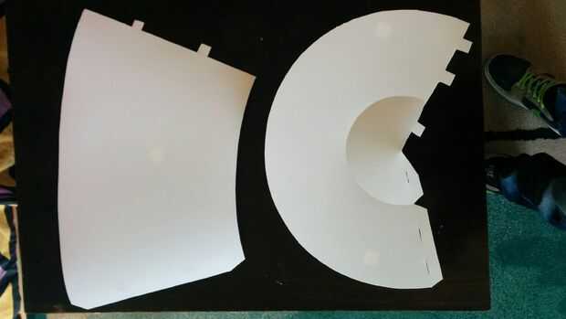Dibujar y arco con un radio de 25 cm a 216 grados (la distancia entre el extremo del arco debe ser 47,5 cm). Añadir líneas desde el punto del centro a los extremos del arco. Dibujar un arco adicional desde el mismo centro con un radio de 10 cm, este arco se dobla crear la punta invertida (ligeramente ir sobre ella con un cúter asegurándose de no perforar a través de él y doblar antes de cerrar el cono). Añadir labios y pestañas como la primera vez para cada parte por separado, una pestaña de la parte interior y dos para el exterior (los labios deben ser independientes también).