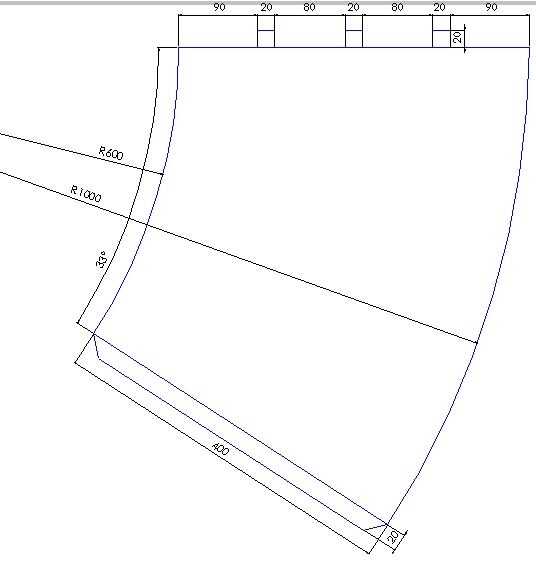 Dibujar un arco con un radio de 60 cm en 33 grados (si no tienes un goniómetro sólo puede medir la distancia entre los extremos del arco que debe 34,1 cm). Desde el mismo centro del primer arco se dibuja otro arco con un radio de 100 cm a 33 grados alineando con el primer arco (distancia entre el extremo de este arco debe 56,8 cm). Conecte los extremos de ambos arcos y asegúrese de que la distancia entre ellos es de 40 cm en cualquier punto dado. En un lado de la forma que ha creado dibuje un borde de 2 cm de ancho con extremo diagonal. En el otro lado dibujar 3 lengüetas distribuida uniformemente a lo largo de la línea de 2 X 2 cm, estas fichas pasará a la línea de la primera cara así que en los mismos lugares que usted dibujó las pestañas cortadas ranuras el lado con el labio. Estas fichas alinearán los dos lados de su forma cuando se cierre la gira a un cono.