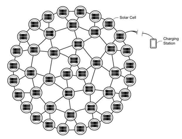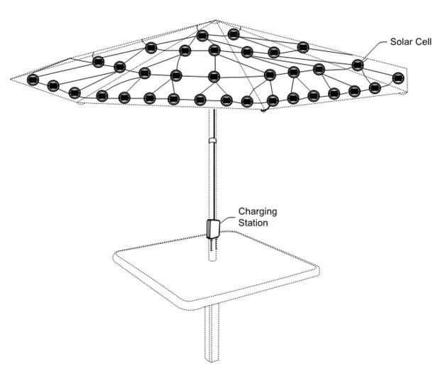 Mi idea era construir una "cubierta solar" para sombrillas de bistro. Consistiría en un conjunto de células solares redondas con cable para proveer energía para cargar dispositivos móviles. La cubierta deberá colocarse encima de parasol existente. Un cable (que contiene varios puertos de carga) podría pasarse con los clips desde el borde de la sombrilla, por debajo y luego bajar el eje donde los usuarios podían conecta sus dispositivos.