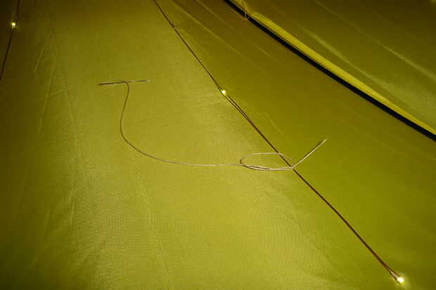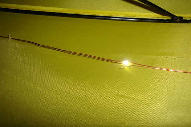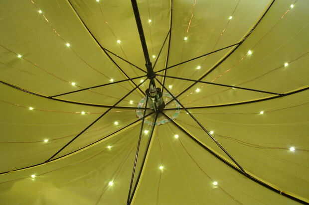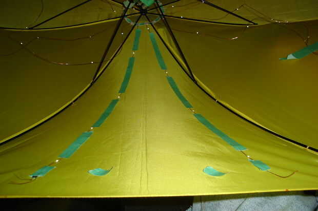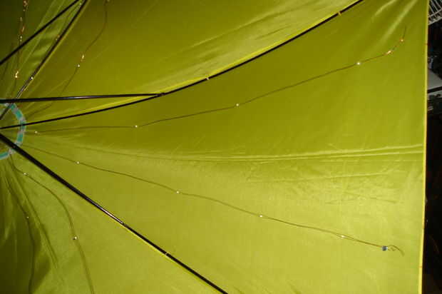Una vez que están todo en su lugar, retire la cinta adhesiva y cortar el exceso de alambre en los extremos y bordes. Intenta añadir el poder de ver el paraguas como se verá. Aún no está terminado, pero este es el punto donde finalmente parece que es y se puede ver el efecto de la iluminación por primera vez.