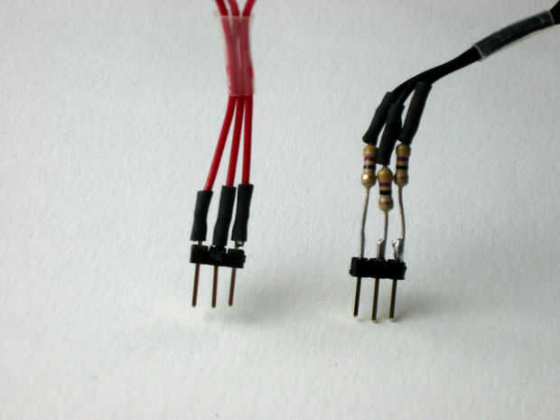 Del mismo modo que las cabeceras para las cadenas de cátodo. Esta vez, sin embargo, las ubicaciones de pin en el Arduino dicten que hacer dos. También hay que soldar una resistencia única en línea. La resistencia depende del LED y tensión, consultar una calculadora de LED-resistor en línea para el valor apropiado. Cada jefe debe tener 5 cinco pernos. Asegúrese de hacer las conexiones de una manera lógica.