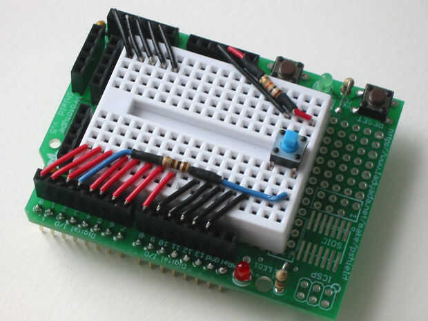 Este proyecto utiliza la Protoshield de Adafruit Industries con un protoboard pequeño (aunque cualquier configuración que se ajusta en el paraguas debe funcionar). La placa pequeña tiene 17 diecisiete filas y este proyecto utiliza a todos! Tenga en cuenta que la placa que se muestra no incluye la MIC2981. No tengo uno. Sin embargo. El paraguas funciona bastante bien sin ella, que decidí escribir este instructable antes de conseguir uno.