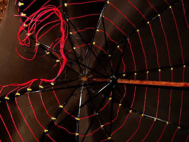 El paraguas no se cierra bien. Supongo que debo haber mencionado esto. Aunque yo no he hecho todavía, voy a coser unos lazos alrededor de los LEDs y en la costura de la tela para sostenerlas en lugar. Mira cuidadosamente las costuras de los paneles y se verá un poco de material en el cual usted puede coser.