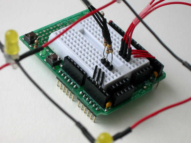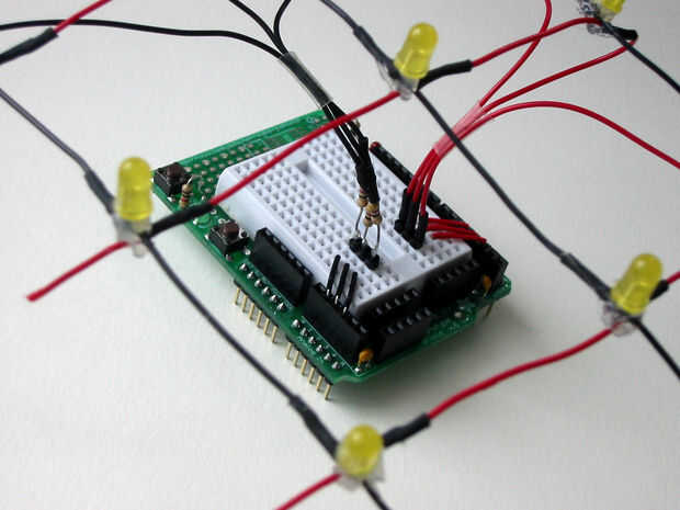 La muestra de código debajo de la maqueta no tomar ventaja de la MIC2981 (lo escribí antes tenia uno). Cada LED se ilumina a su vez. Esto funciona para una matriz de 3 x 3 pero no escala bien. [En realidad, escalas razonablemente bien a la matriz completa pero los LED son un poco déviles.]
