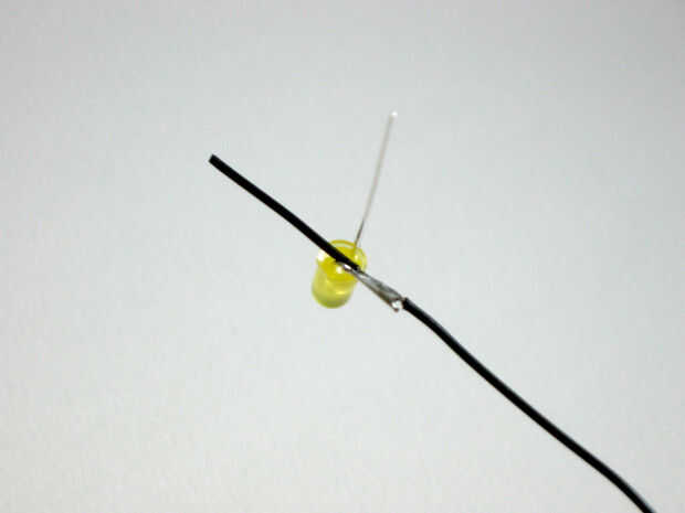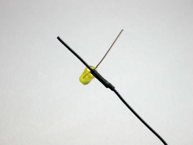 Obtener una pequeña gota de estaño en la punta de la plancha. Coloque el LED para que el hilo pase entre los dos conductores del LED y aplicar la plancha caliente para el cátodo de la soldadura. La soldadura en el hierro y el alambre debe fluir para hacer una conexión. Se quema el dedo y taze será usted. Después de soldar, cortar el ánodo para que sea lo más corto posible.