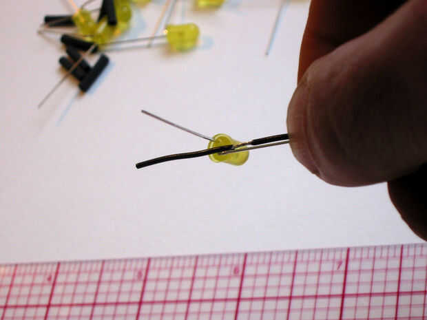 Para evitar un cortocircuito, cada empalme de la soldadura se cubre con un trozo de tubería del encogimiento del calor. La tubería debe aplicarse después de una conexión y antes del siguiente LED está conectado (cualquier confusión? pronto entenderás :-) así que deslice un trozo por ahora. Calor para reducir el tamaño en su lugar.