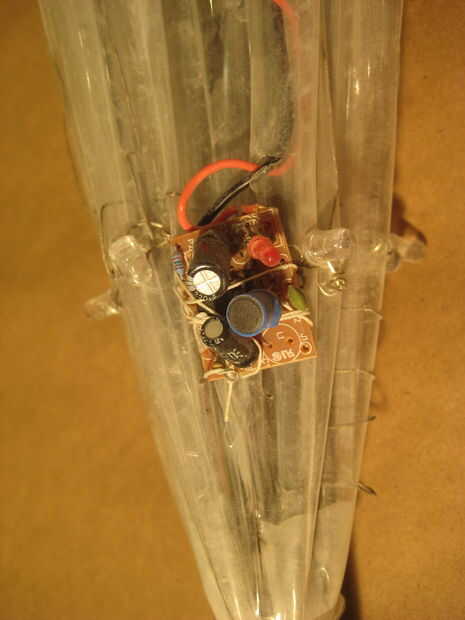 Cosí una funda para la batería usando la antigua correa de nylon. Velcro me permite abrir y cerrar la funda para reemplazar la batería. Entonces zip-até la funda a dentro de la parte superior de la sombrilla en una costilla y el tubo principal.