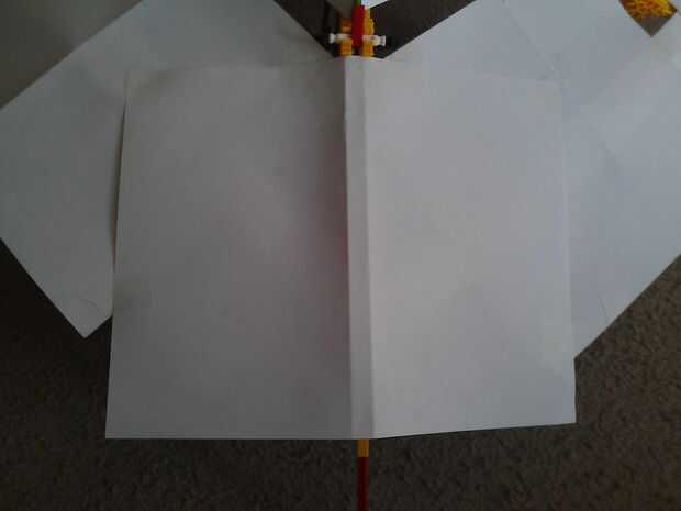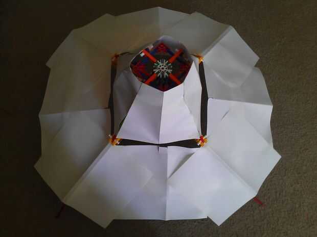 Adjuntar los papeles al paraguas para que cubren las esquinas expuestas. Las "espinas del libro" deberían estar directamente sobre los brazos de la sombrilla.