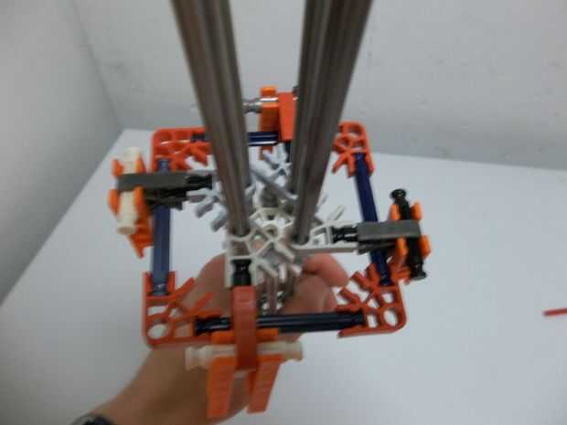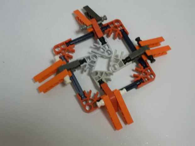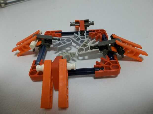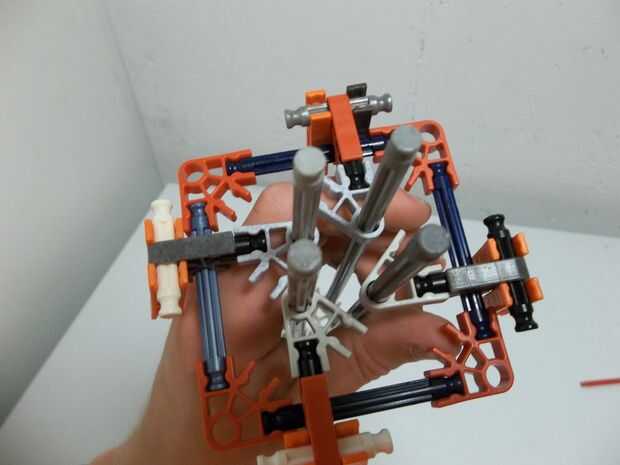 Esta es la parte móvil de la sombrilla que controla el movimiento. Observe cómo el conector rojo ajustado a las barras de azul han sido trasladados hasta el extremo de cada varilla azul. Esto le ayudará a fijar esta pieza al mango más fácilmente.