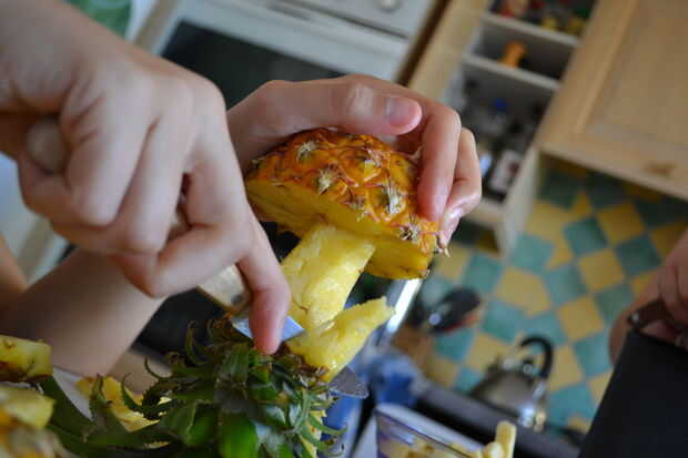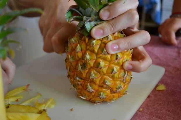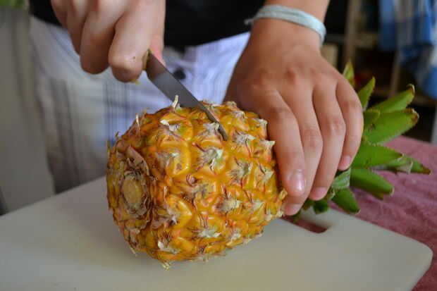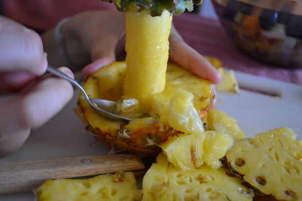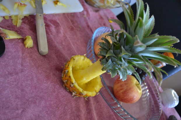 Para preparar la piña corta en un círculo de aproximadamente 2 pulgadas por encima de la base sin necesidad de cortar la base de la fruta. Si la piña no soporte estrecha corta una pequeña porción en la parte inferior para tener una base plana. A continuación, cortar para sacar la fruta desde la base, dejando solamente la base que representa el tronco del árbol. Por último, vaciar la base de la fruta para dejar un recipiente como el fondo en el que se colocará la ensalada de frutas.