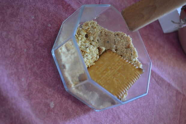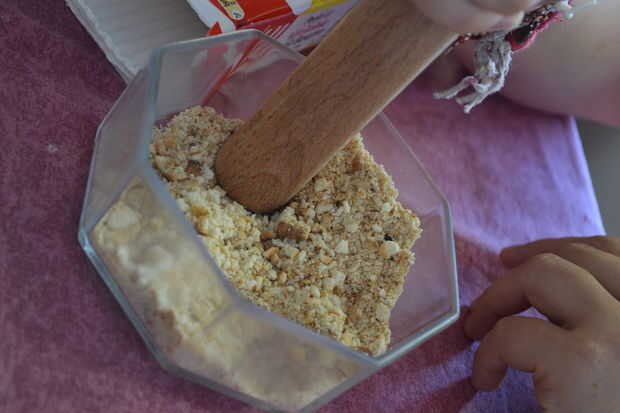 Usando el el mortero y Maja o cualquier recambio que tienes para ellos machacar tus cookies o galletas a migas para formar la arena comestible.